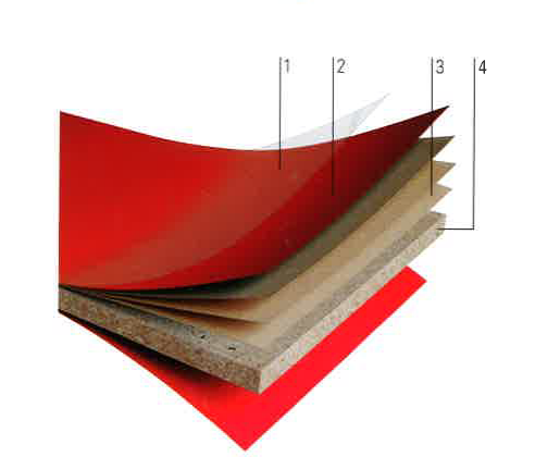 Le stratifié est obtenu par l'empilage d'une feuille de papier décor et de feuilles de papier kraft imprégnées de résine thermodurcissable puis pressées à chaud pour polymérisation. La feuille de stratifié est ensuite plaquée sur un panneau. C'est un matériau très robuste avec une grande résistance aux rayures, aux UV et à la chaleur (jusqu'à 180°). Il est utilisé généralement pour les plateaux des tables.